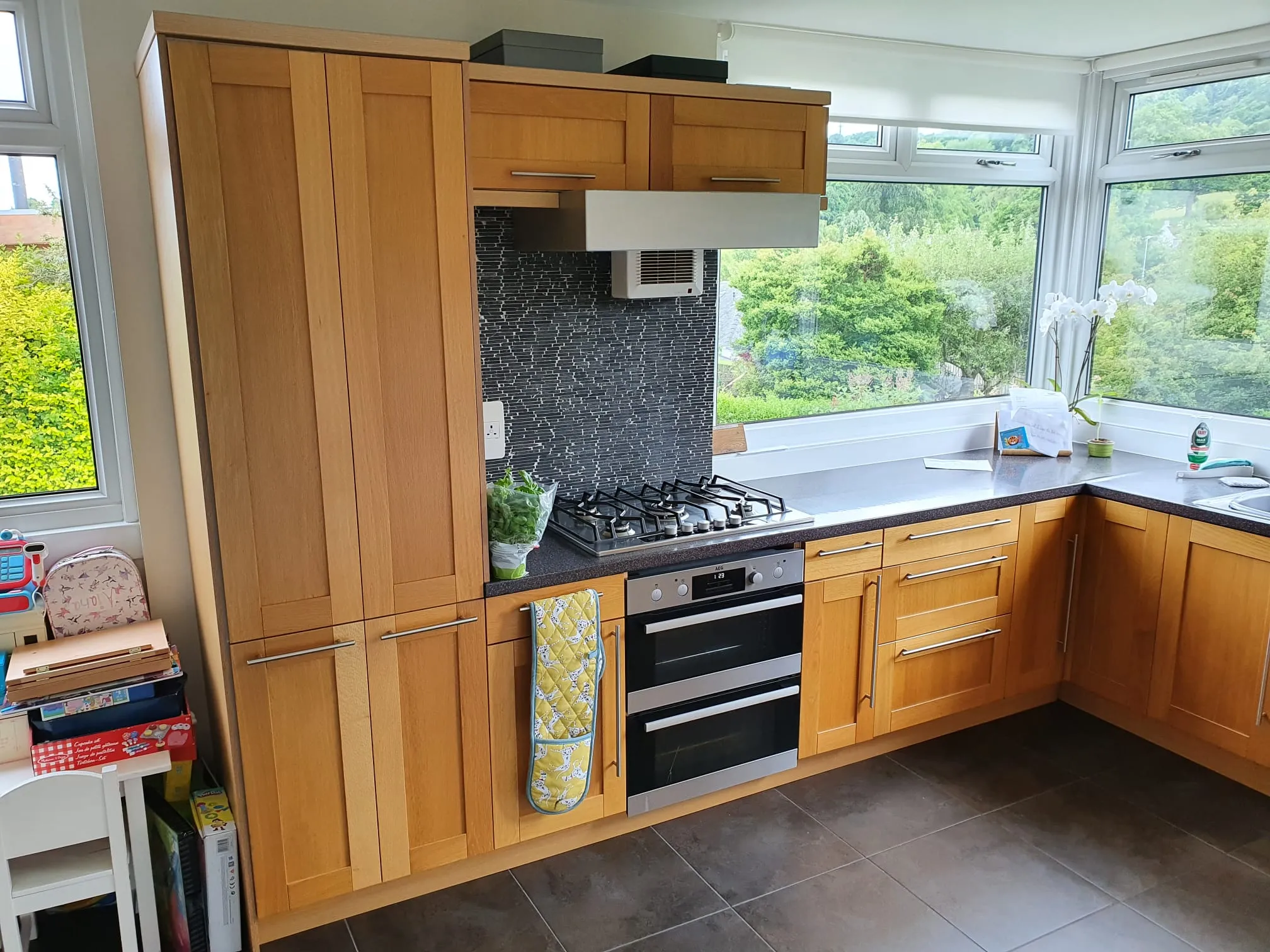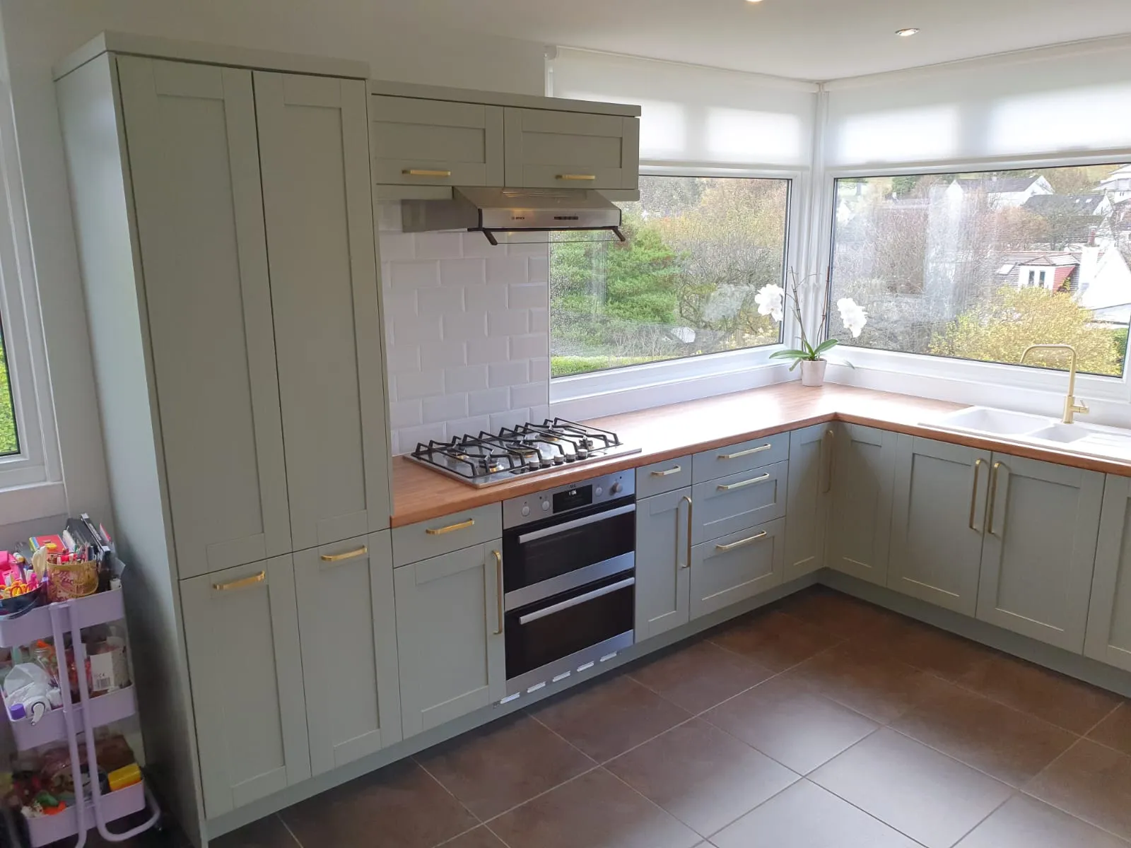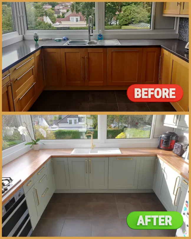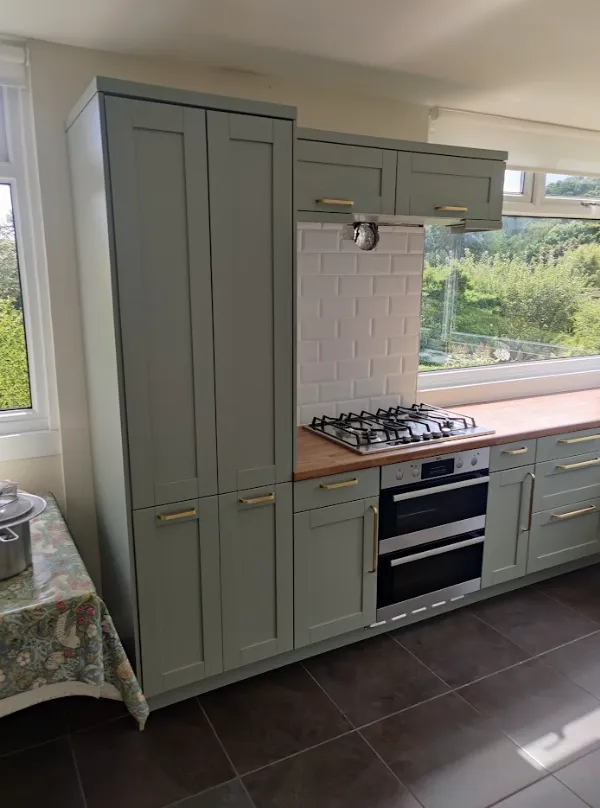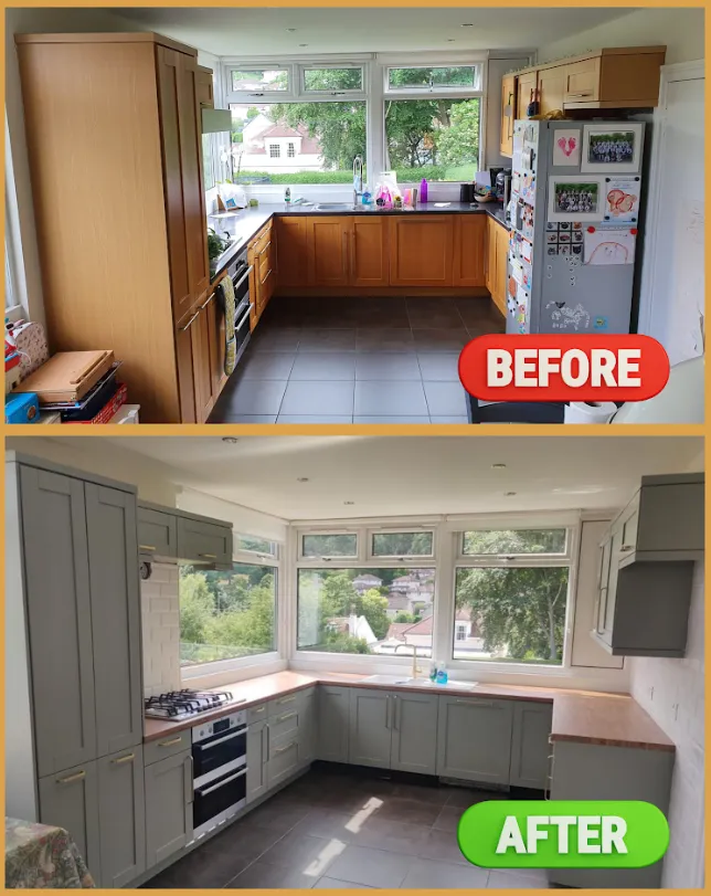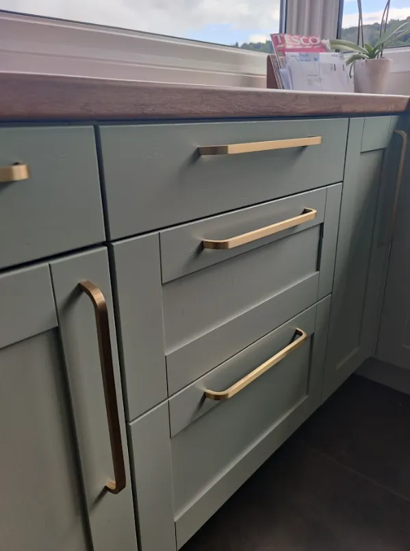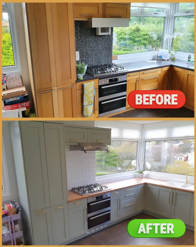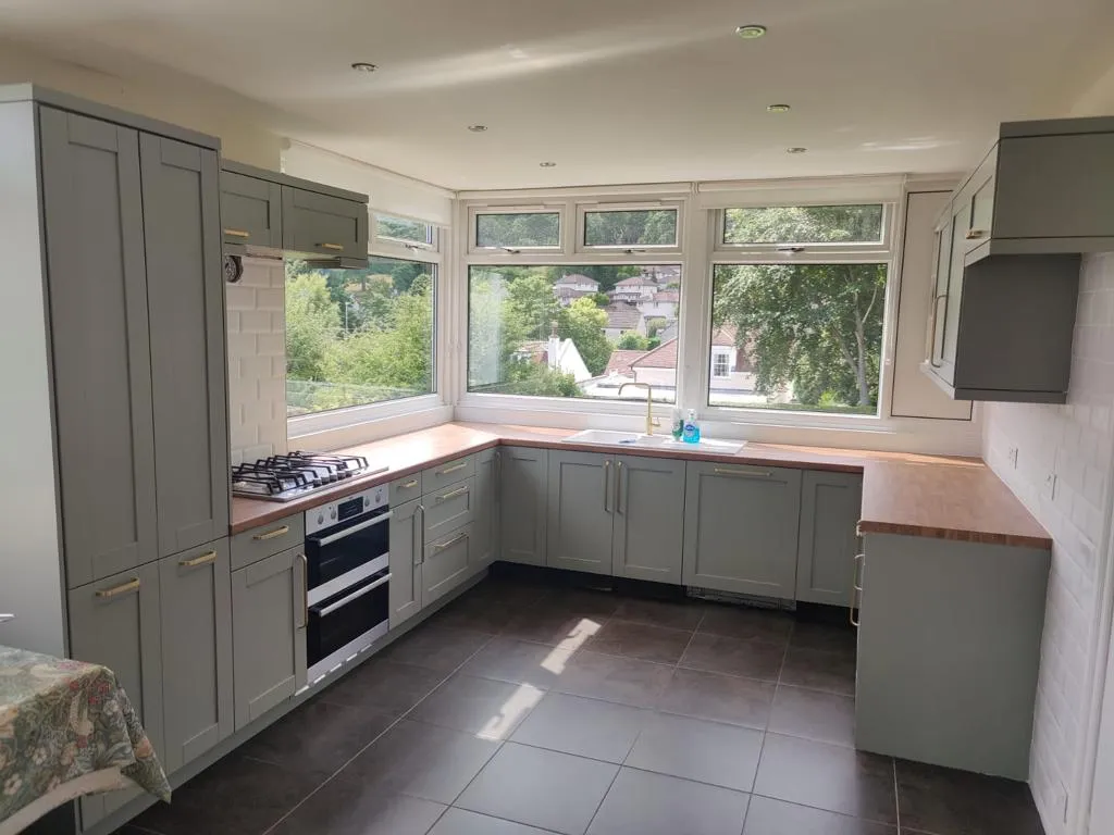 The kitchen cabinets received a high-quality facelift through expert spray painting techniques. The client opted for Farrow & Ball No. 25 Pigeon with a 10% gloss finish. Additionally, we upgraded the door handles to gold, significantly enhancing the kitchen’s overall standard. The elegant combination of green and gold creates a striking and luxurious aesthetic.