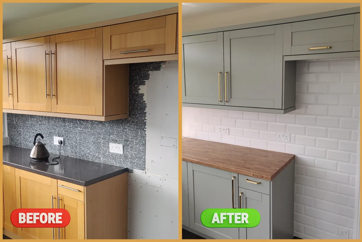 Jack paired the new worktop with white metro tiles for the walls to visually enhance the space. Our tilling specialist removed the old tiles, repaired the walls and installed new metro tiles. The overall effect of the combination was impressive beyond the client’s expectations.